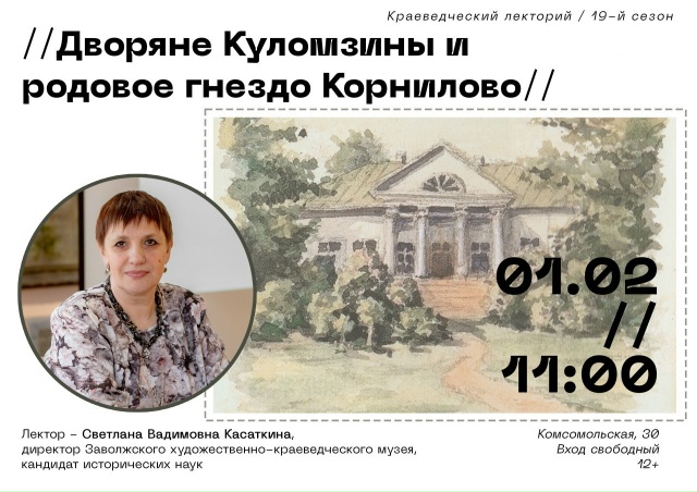 В воскресенье, 1 февраля, директор Заволжского художественно-краеведческого музея, кандидат исторических наук Светлана Вадимовна Касаткина выступит с докладом: "Дворяне Куломзины и родовое гнездо Корнилово". Встреча по традиции пройдет в картинной галерее (ул. Комсомольская, д. 30). Начало в 11:00.