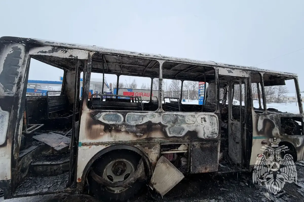 "Пазик" полностью уничтожен огнем. От транспортного средства остался только обгоревший кузов.
