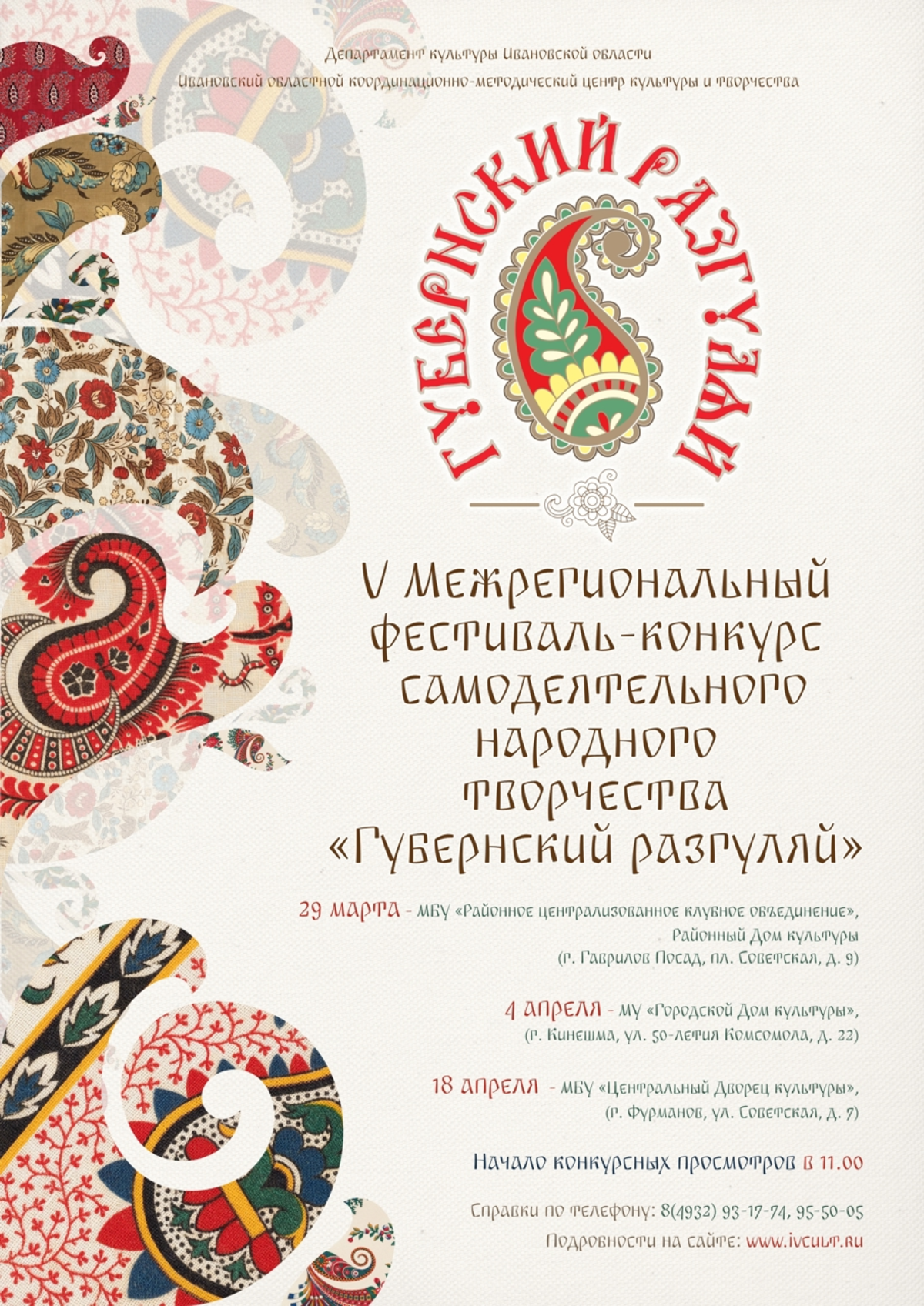 Областной координационно-методический центр культуры и творчества объявил о начале V межрегионального фестиваля-конкурса самодеятельного народного творчества "Губернский разгуляй" (18+). Первый зональный этап пройдет в конце марта в Гавриловом Посаде. Об этом сообщает администрация Центра культуры и творчества в "ВКонтакте".
