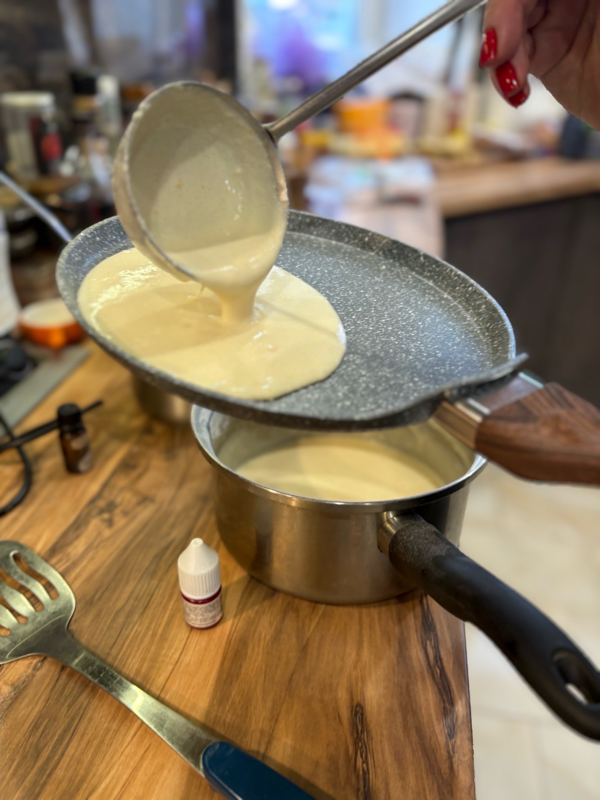 Температура – ключ к текстуре. Молоко – комнатной температуры. Яйца – не из холодильника. Сковорода – хорошо прогрета. Холодные ингредиенты = плотные блины.