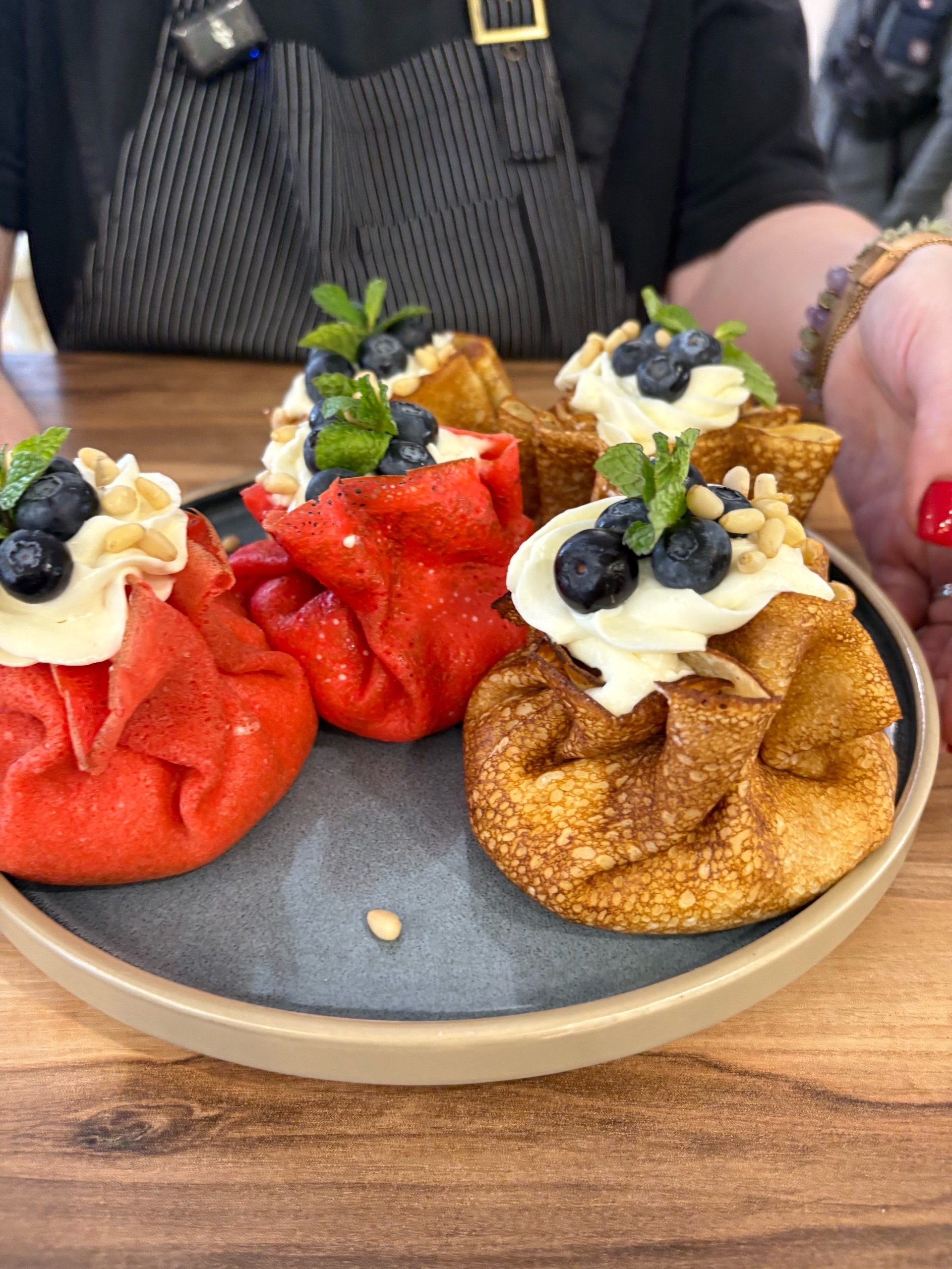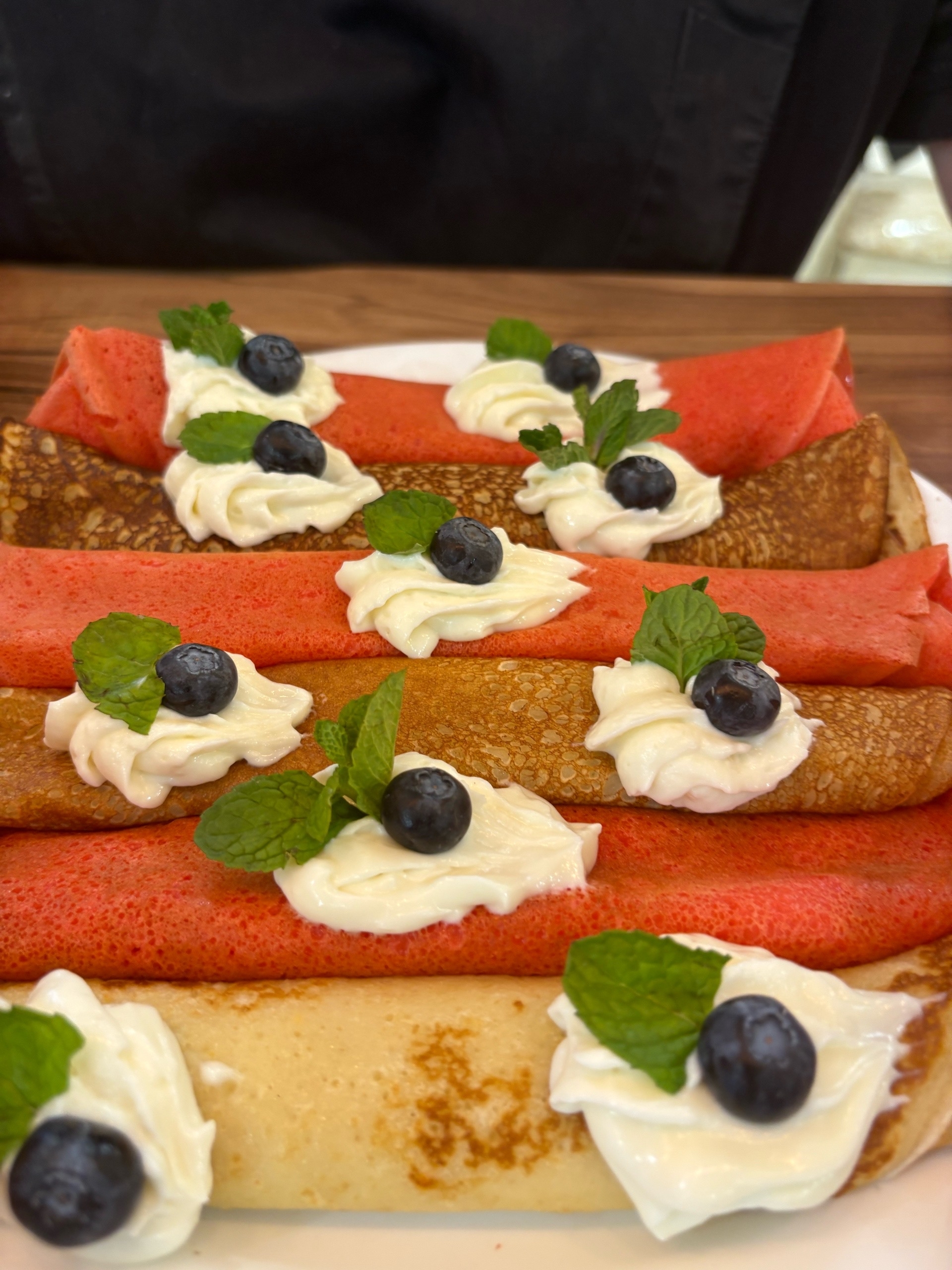 При подаче свернуть трубочками с творожным кремом и ягодным соусом.