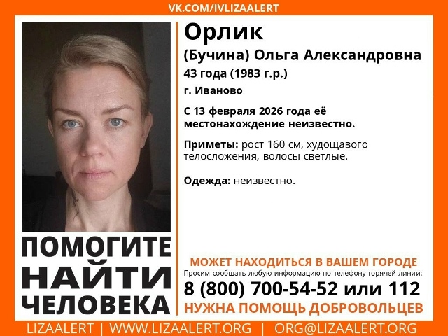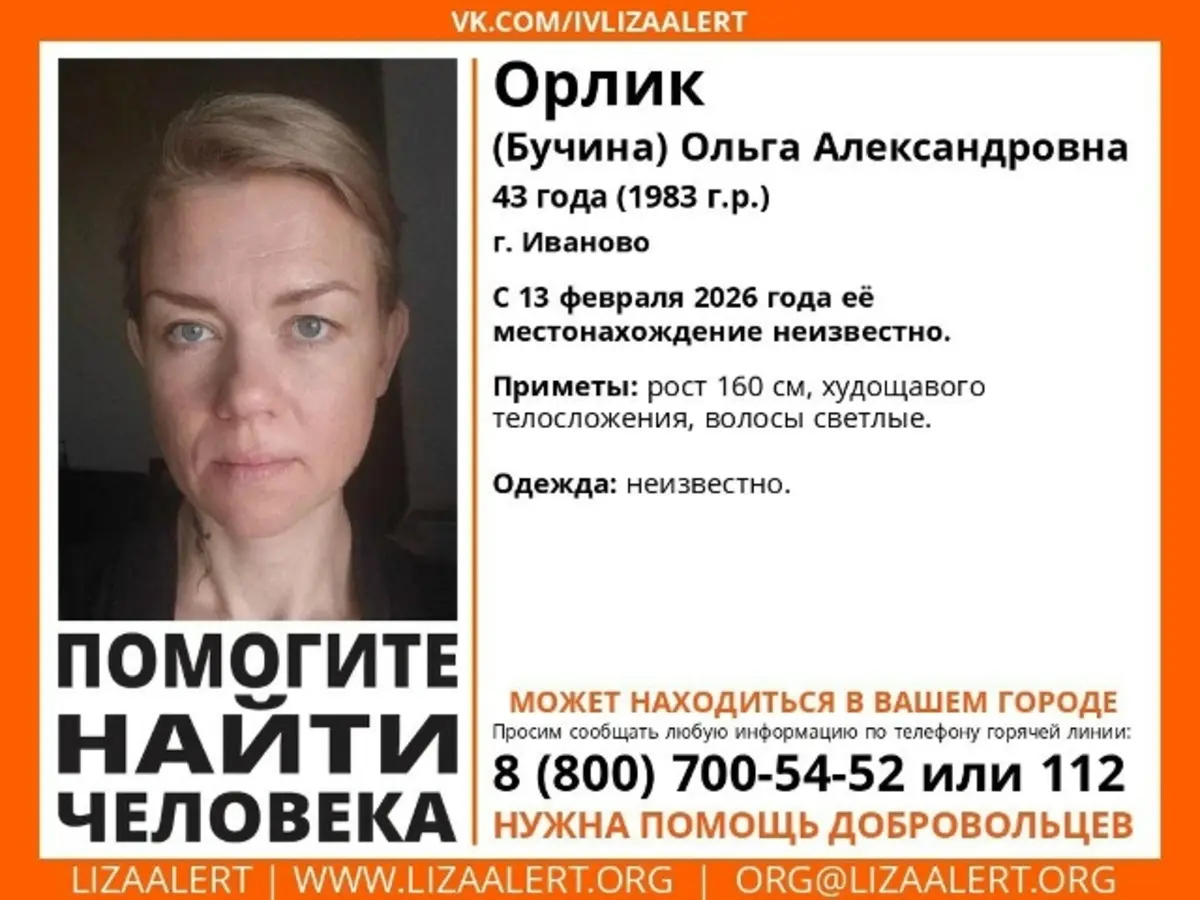 Добровольцы поисково-спасательного отряда Ивановской области "ЛизаАлерт" просят помочь в поиске пропавшей 13 февраля 43-летней Орлик (Бучиной) Ольги Александровны. Об этом волонтеры сообщают в "ВКонтакте".