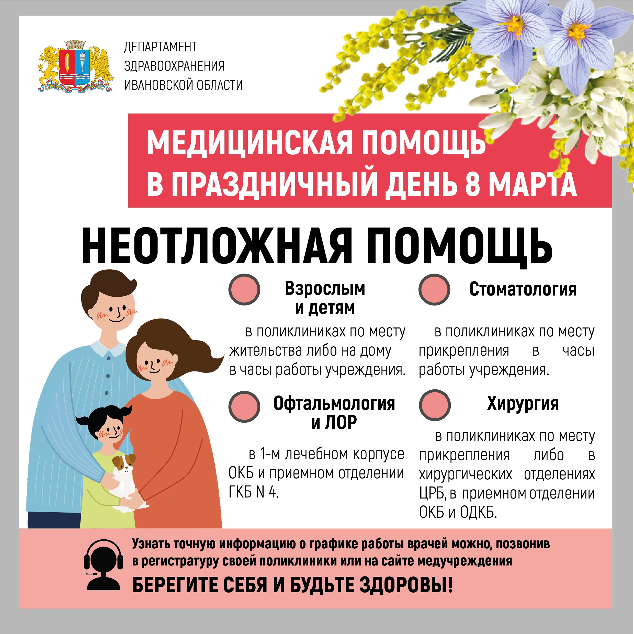 Кроме того, в часы работы поликлиник по месту жительства ивановцам будет оказана неотложная помощь в хирургии и стоматологии, а в областной клинической больнице и горбольнице №4 медики окажут помощь в области офтальмологии и отоларингологии.