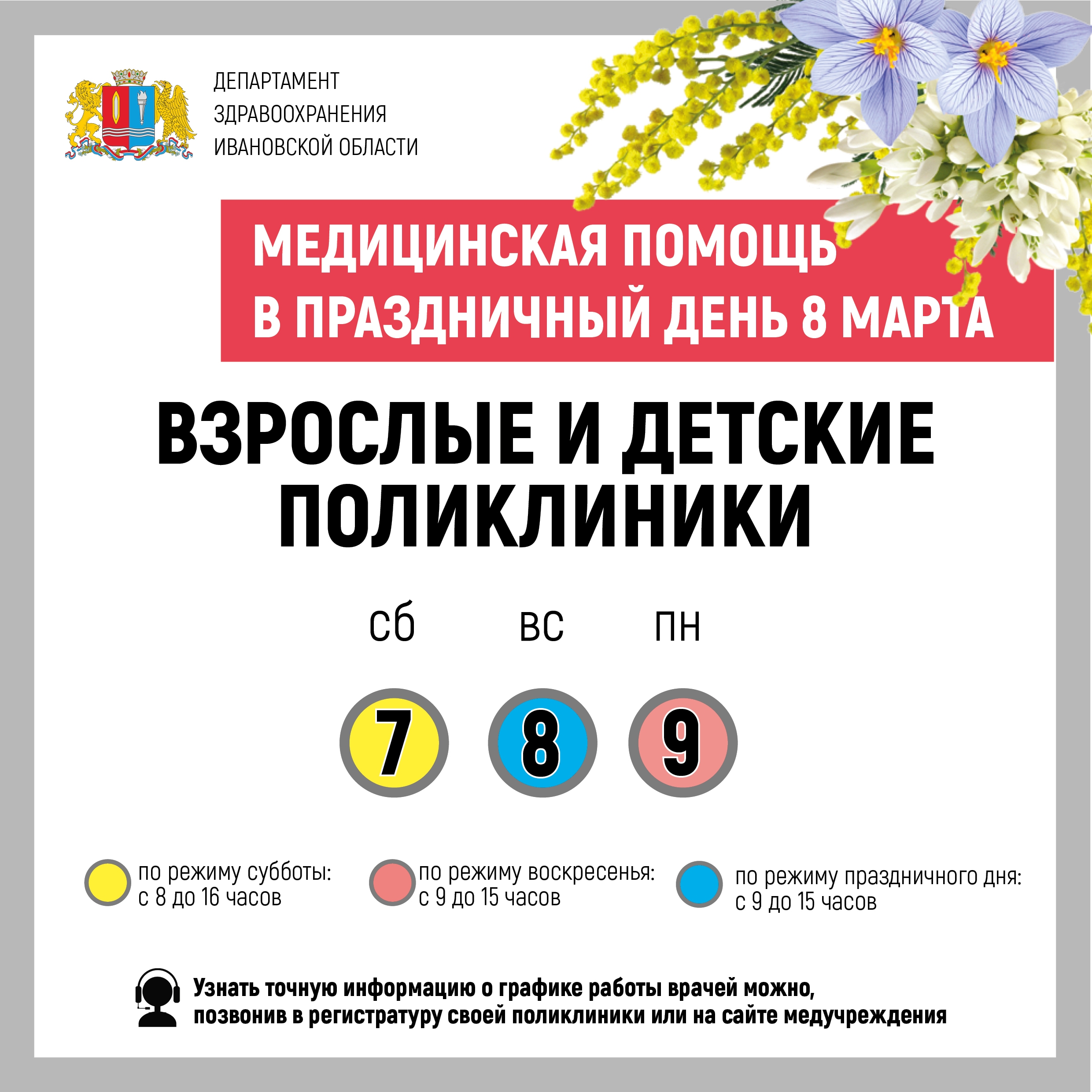 Медучреждения Ивановской области в Международный женский день 8 Марта будут работать по особому графику. Расписание работы больниц региона сообщила пресс-служба департамента здравоохранения региона в "ВКонтакте".