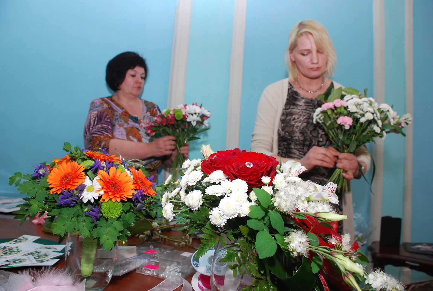 В сборные букеты можно поставить диантусы с теми же хризантемами – они долго простоят и будут выглядеть хорошо. Под розы нужно больше половины сосуда воды, под хризантемы несколько сантиметров, под тюльпаны вообще один – они сразу вянут от избытка влаги.