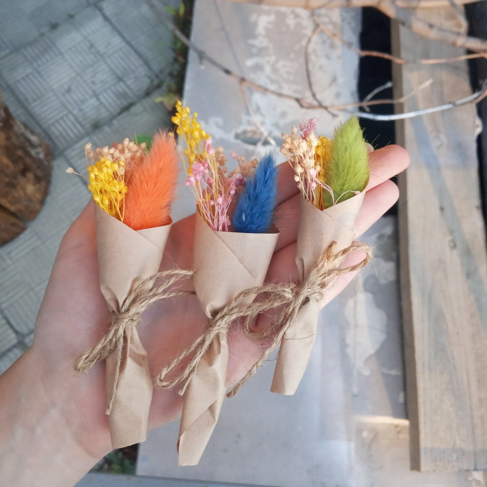 Один из наборов-схем букета где-то на 1500 рублей – пять тюльпанов, маленькая хризантема сантини, стацица, хлопок и упаковка. Смотрится мило и эффектно.