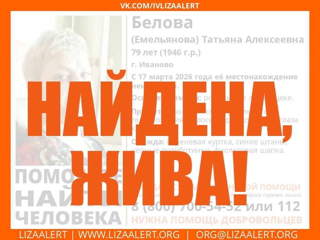 Пропавшая 17 марта Татьяна Белова (Емельянова) из Иванова нашлась. Она жива. Об этом сообщила пресс-служба поисково-спасательного отряда Ивановской области "ЛизаАлерт" в "ВКонтакте".
