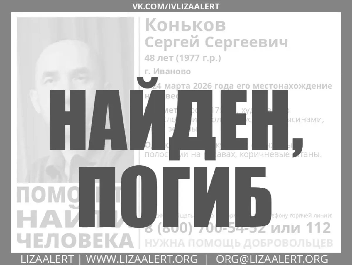 Пропавший две недели назад в Иванове 48-летний Сергей Коньков нашелся. Он погиб. Об этом сообщила пресс-служба поисково-спасательного отряда Ивановской области "ЛизаАлерт" в "ВКонтакте".