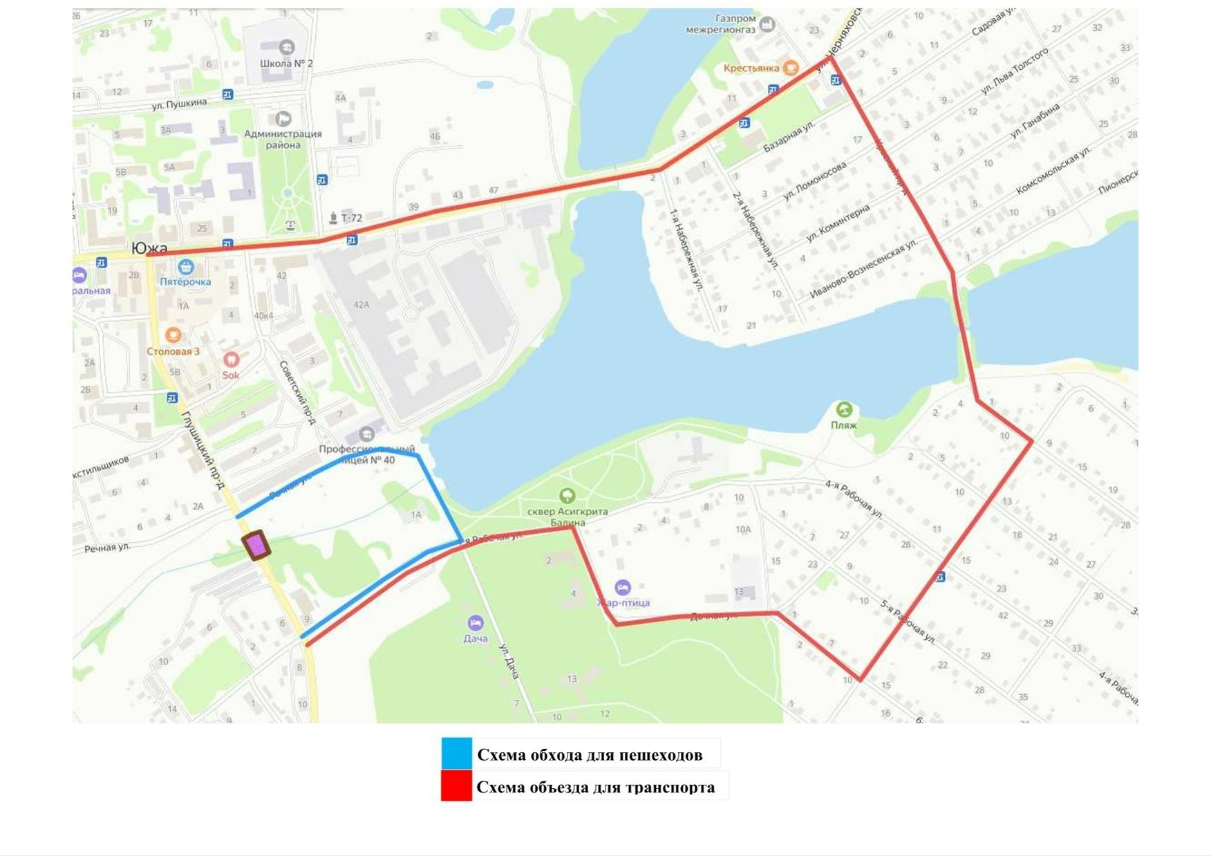 Схема объезда для транспорта: ул. Советская - ул. Черняховского – Красный проезд – объездная дорога – ул. Дачная – ул. 4-я Рабочая – ул. Куйбышева.