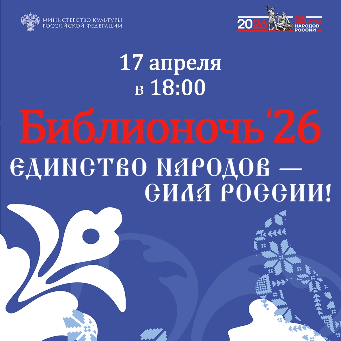 "17 апреля в 18:00 наша библиотека открывает двери для всех, кто любит традиции, творчество и хочет прикоснуться к наследию нашей страны. Гостей ждут открытие с ансамблем народной музыки "Купель"; мастер-классы по ремеслам и творческие площадки; интеллектуальные игры и викторины, редкие книги и тайны книгохранилища, а также путешествие по традициям народов России", – пишут они.