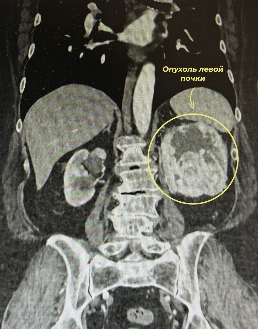 С самого начала рак никак себя не проявлял – женщина пришла к врачам уже когда появились тянущие боли в пояснице и кровь в моче. На МСКТ врачи обнаружили злокачественное новообразование левой почки, оцененное по системе R.E.N.A.L. в 10 баллов.