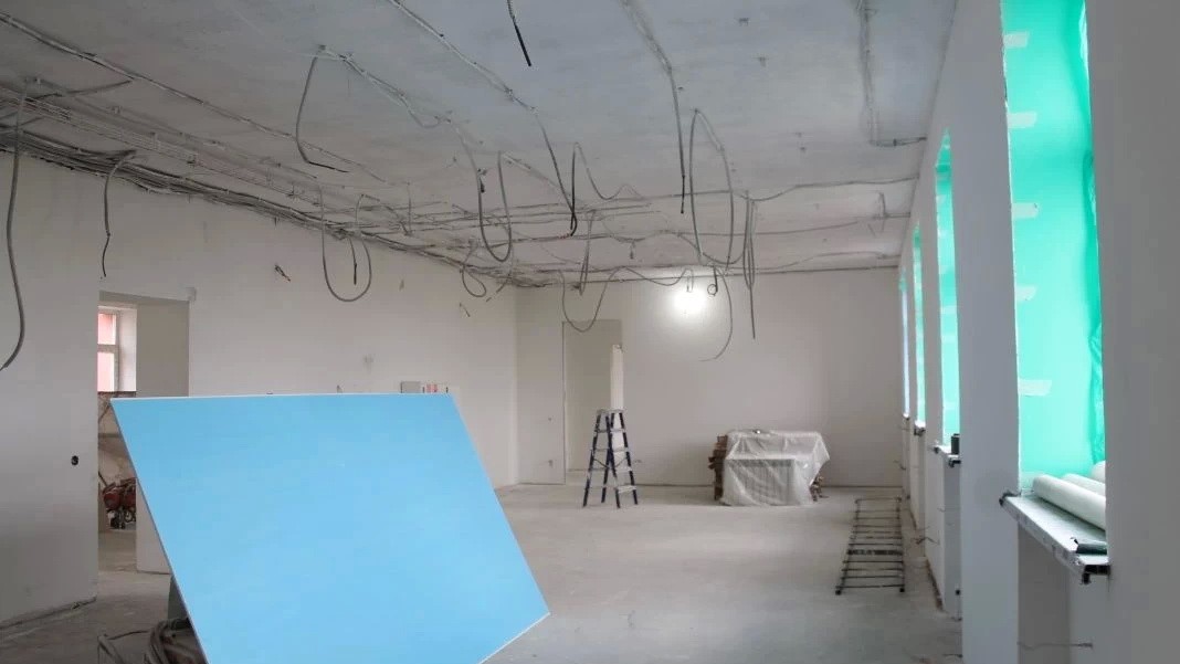 Параллельно идет ремонт в детском культурно-просветительском центре. Строители демонтировали старые покрытия и инженерные сети, заменили окна и двери, установили новые радиаторы и смонтировали электропроводку. Уже сделана сухая стяжка пола и подвесные потолки.