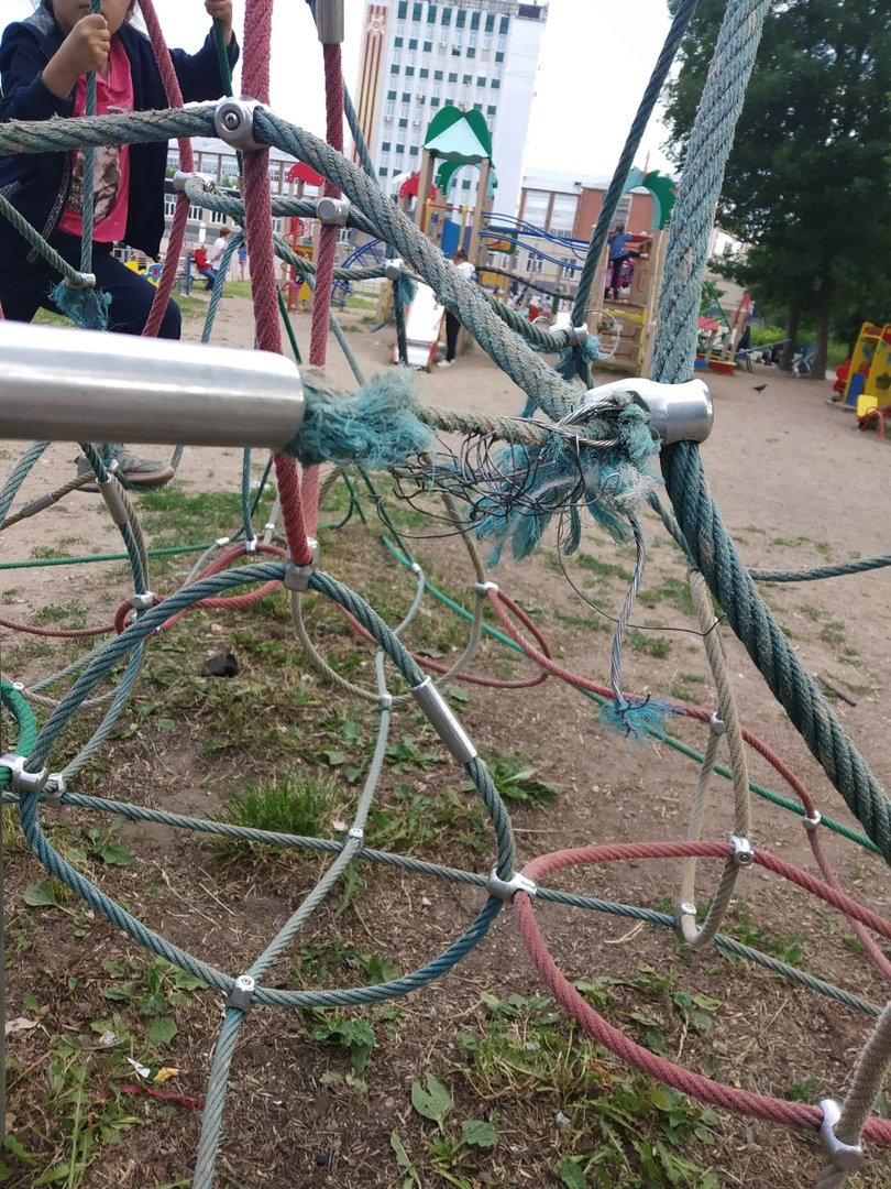 Судя по фотографиям, опубликованным в интернете, детские игровые элементы представляют опасность для малышей: на горках отсутствуют ступеньки, на "воздушных" переходах не хватает досок, цепи от качелей оборваны, песочница – без песка, тросы – истрепаны, торчит проволока и гвозди, краска облупилась.