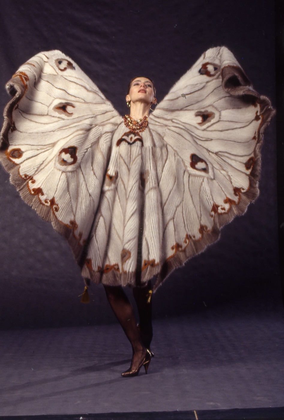 По ее словам, в экспозицию "Королева меха" вошли шубы, накидки из горностая, каракульчи, лисы, нерпы, ондатры, песца, соболя, овчины, кролика, белки. Несколько манекенов в выставочном зале оделись в шубы из уникальной коллекции "Птицы", которая принесла Крутиковой мировую известность и звание лауреата Государственной премии в 1992 г. "Птицы" – это несколько накидок, собранных из тонких меховых пластин с деликатным орнаментом.