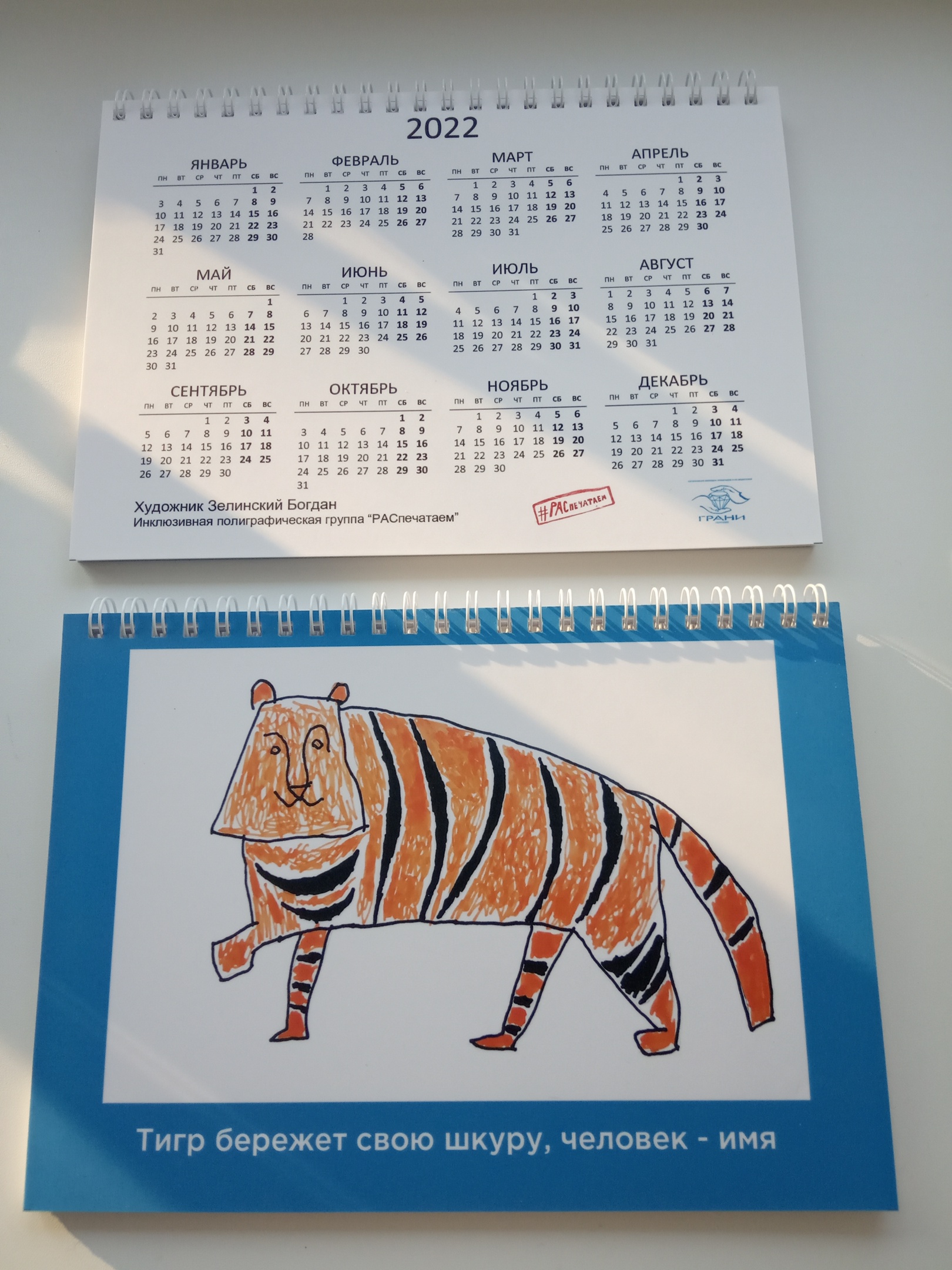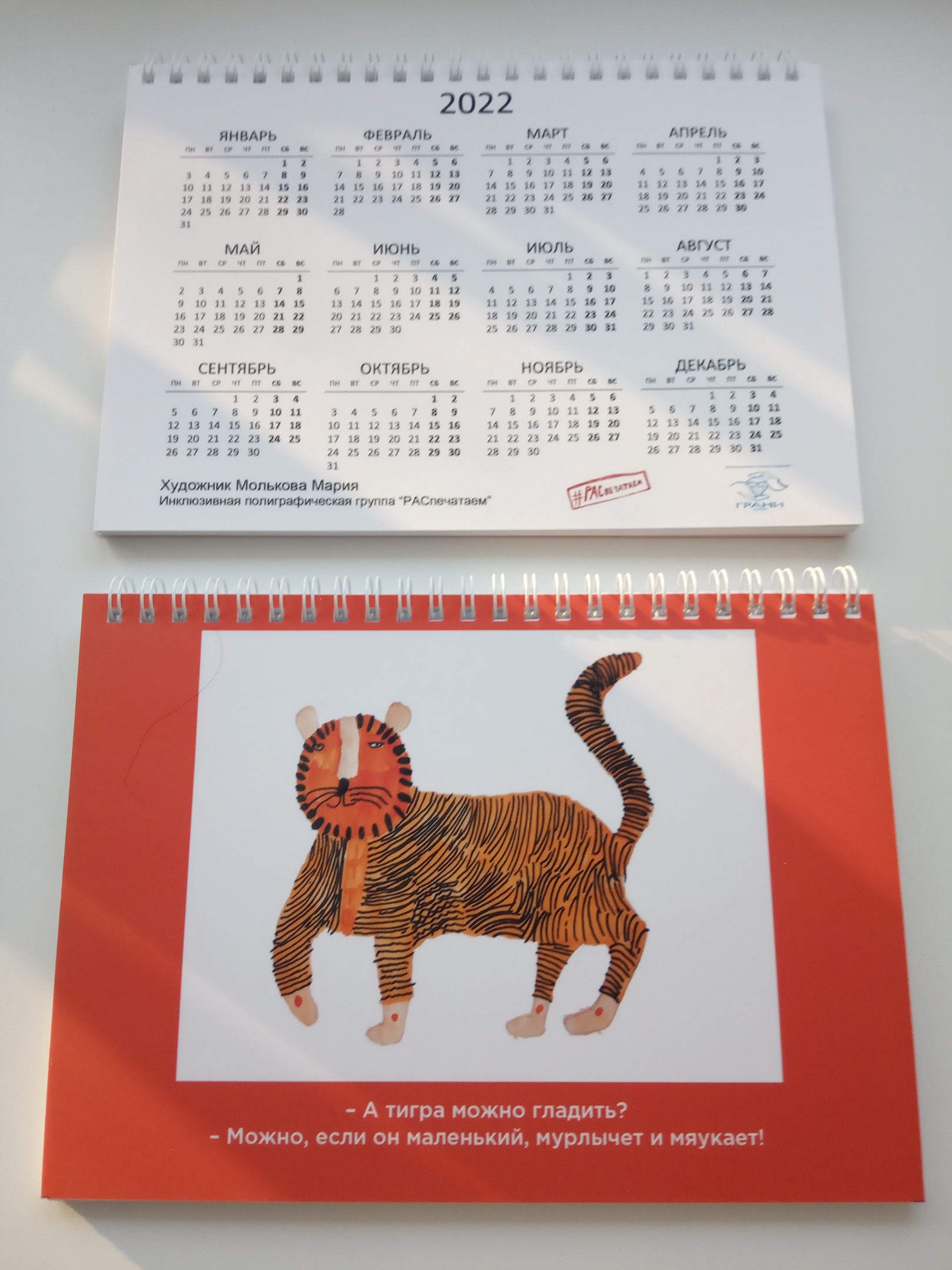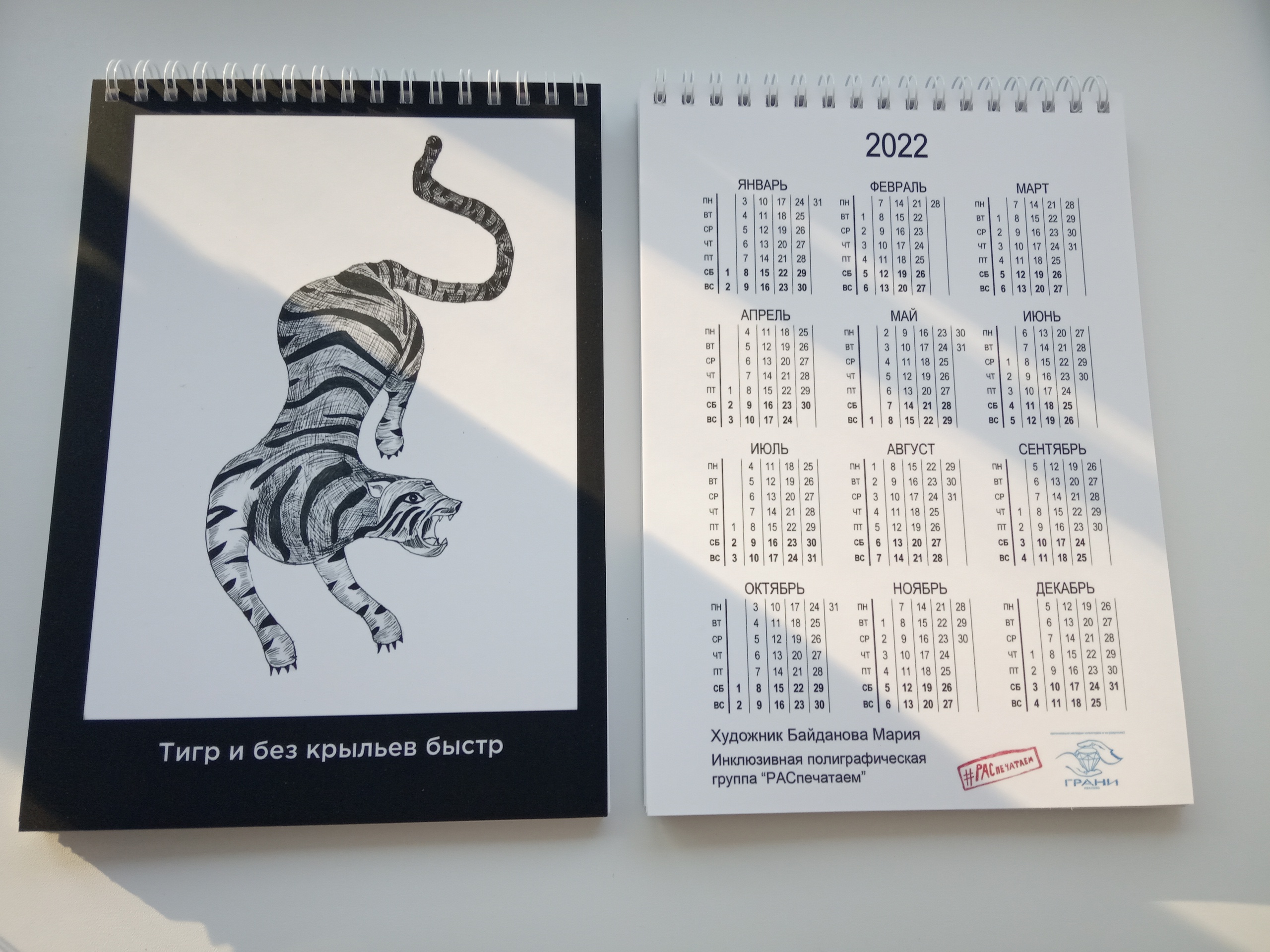 Воспитанники инклюзивной полиграфической группы "РАСпечатаем" общественной организации молодых инвалидов "Грани" выпустили линейку новогодних блокнотов с календарем на 2022 г. Символ года – тигра – нарисовали иллюстраторы с ментальными особенностями. Об этом "Грани" сообщают в "ВКонтакте".