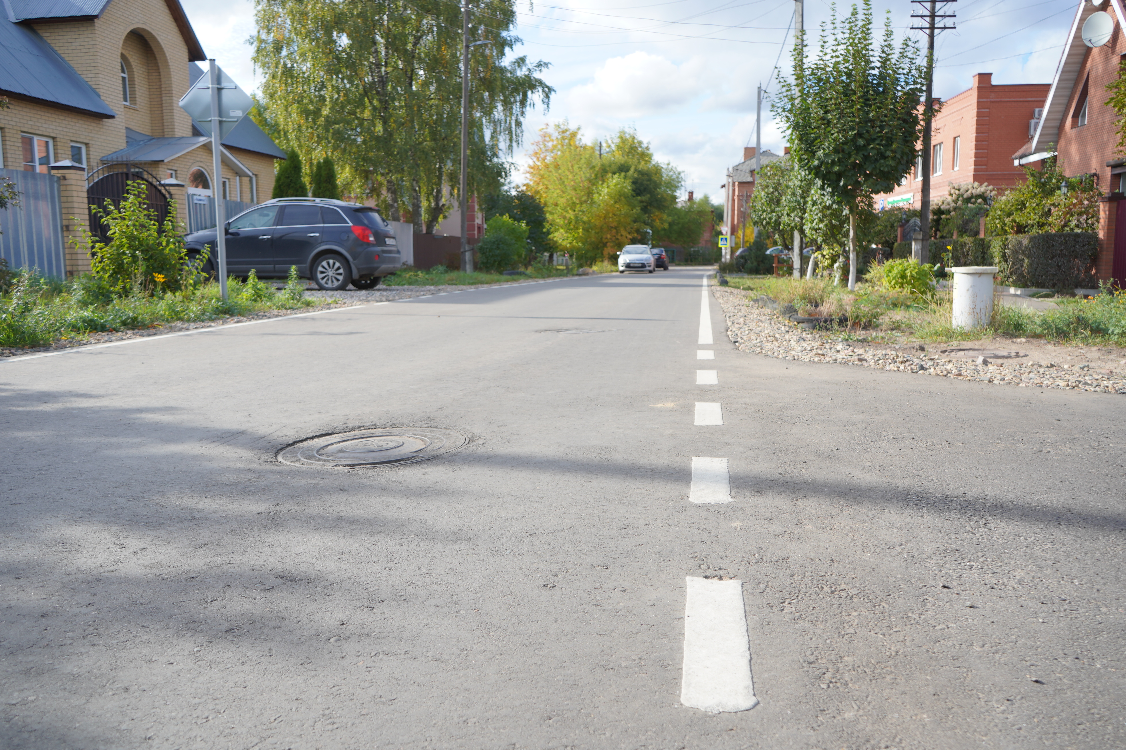 Большая часть дорог – 52 объекта – находятся в частном секторе. Так, на улице Владимирской дорожники поменяли асфальт, установили бордюры и дорожные знаки, обустроили тротуары, пешеходные переходы и нанесли разметку. До ремонта на дороге были грунтовые участки и разбитый асфальт.