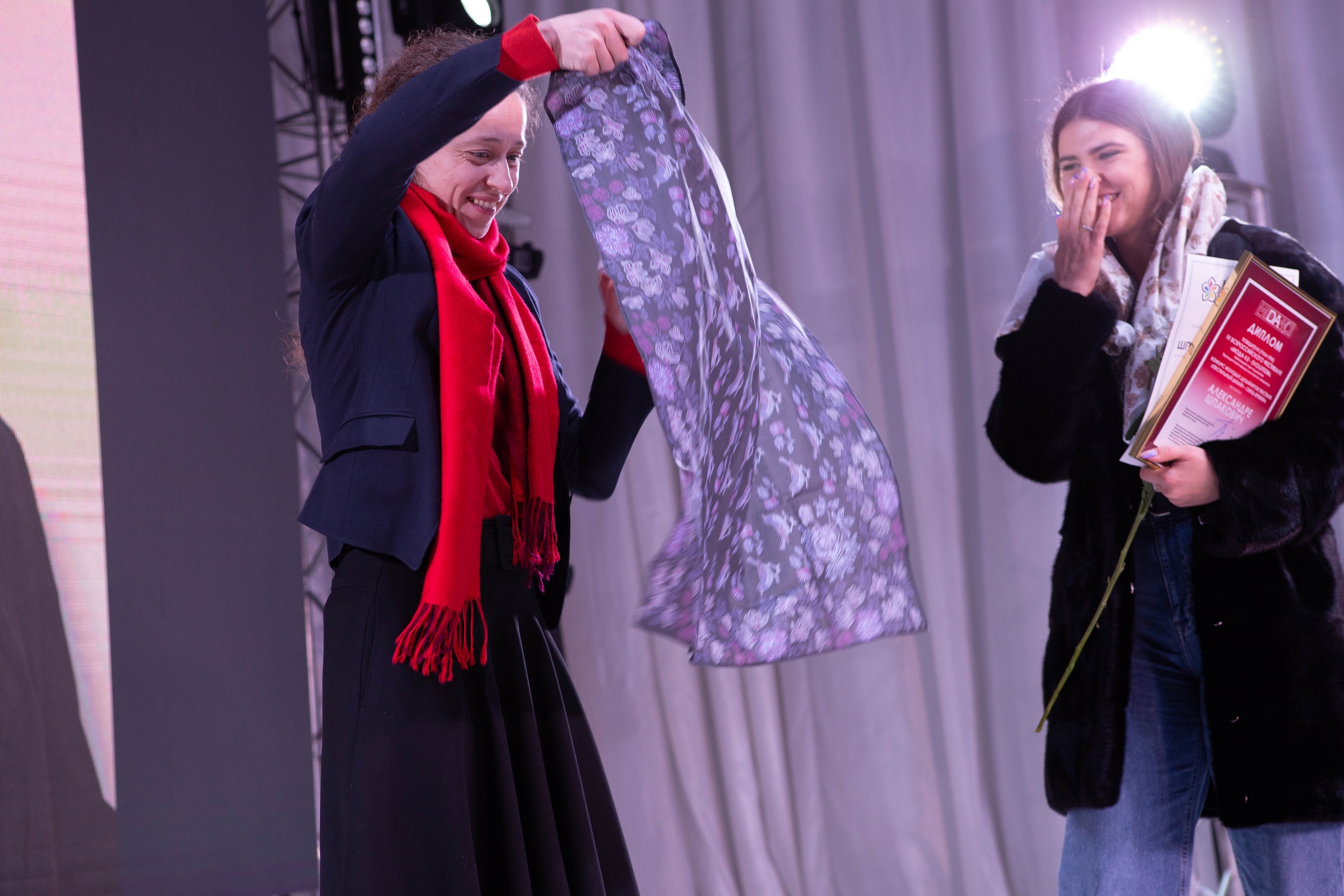 Помимо конкурса на лучший дизайн одежды на фестивале специалисты определяли лучшее решение в ткани. Здесь награду получила Александра Шпакович из Москвы – она создала коллекцию платков, посвященную истории Шуйских мануфактур ХIХ века по мотивам головных платков Товарищества мануфактур Посылина и ситцеплаточной фабрики Рубачевых.