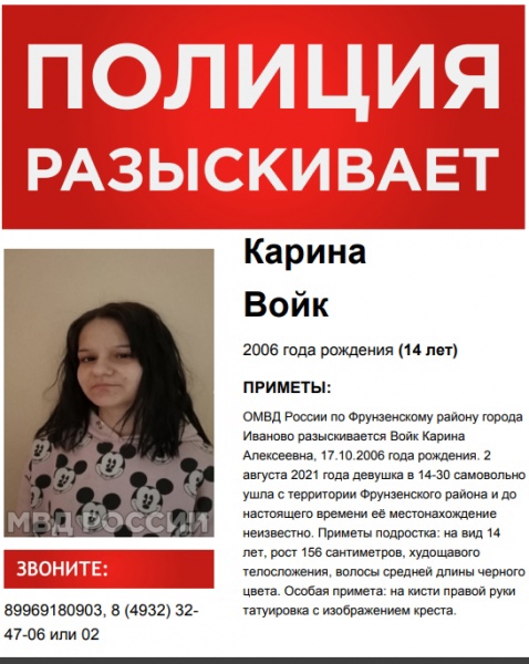 Полиция просит всех, кто располагает любой информацией, сообщить ее по телефонам: 8 996 918 09 03, 8 (4932) 32-47-06 или 02.