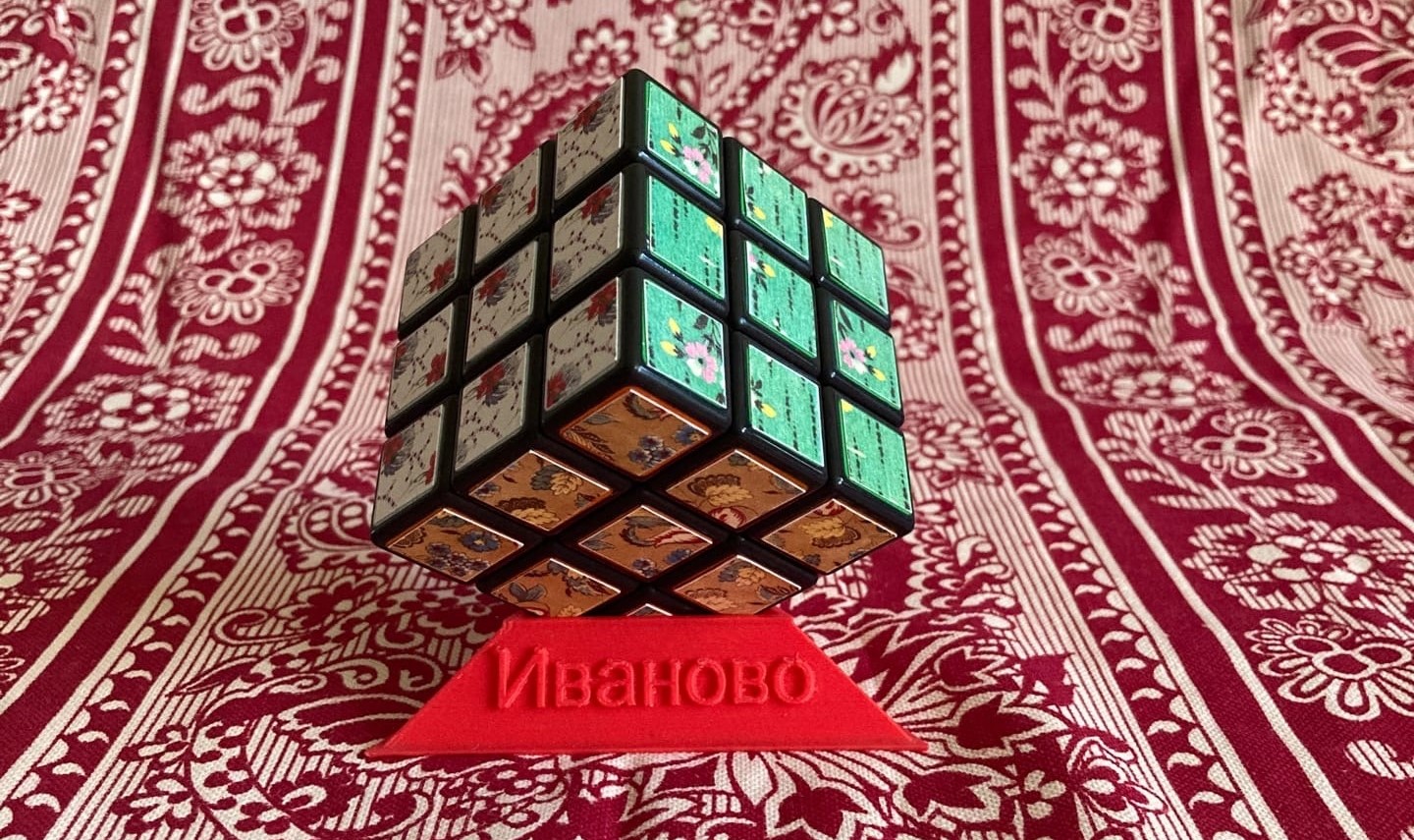 "Андрей в своем хайт-цехе Кванториума.Новатория также решил попробовать делать стикер-моды. И это первый прототип, где использованы паттерны ивановских тканей 18-19 века из коллекции Музея ивановского ситца. Поскольку паттерны очень колоритны и разнообразны, то мы смогли подобрать текстильные рисунки в классических цветах кубика Рубика", – рассказал Дмитрий Маслов.