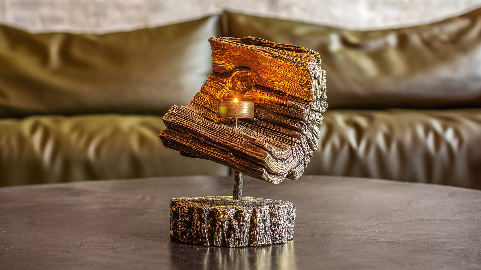 "Часто стволы сухих деревьев попадаются со следами от короедов. На дубах таких следов почти не бывает. Но я просто не поверил своим глазам, когда ноги бронзовой фигурки Иисуса Христа очень точно и четко вошли в два отверстия, оставленные короедами на куске того самого дуба", – говорит мастер. Такое совпадение оказалось очень символичным, как и всё в его работах. Ведь в "Голгофе" перед Христом – сам путь на Голгофу – мастер сделал дерево черным, а сзади – посветлее. И поставил восемь свечей, как символы света, который Христос оставляет в душах людей.