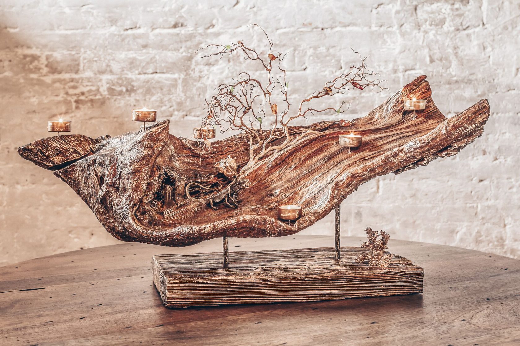 В своих композициях автор часто использует различные фигурки, например, из бронзы. Их он покупает на европейских блошиных рынках или в антикварных лавках. Так у него появилась бронзовая фигурка Иисуса Христа, которая художнику очень приглянулась и ждала своего часа. И дождалась: в лесу художник присмотрел 200-летний дуб – когда его повалило ветром, ствол развалился на четыре части. Тогда у мастера родилась композиция "Голгофа".